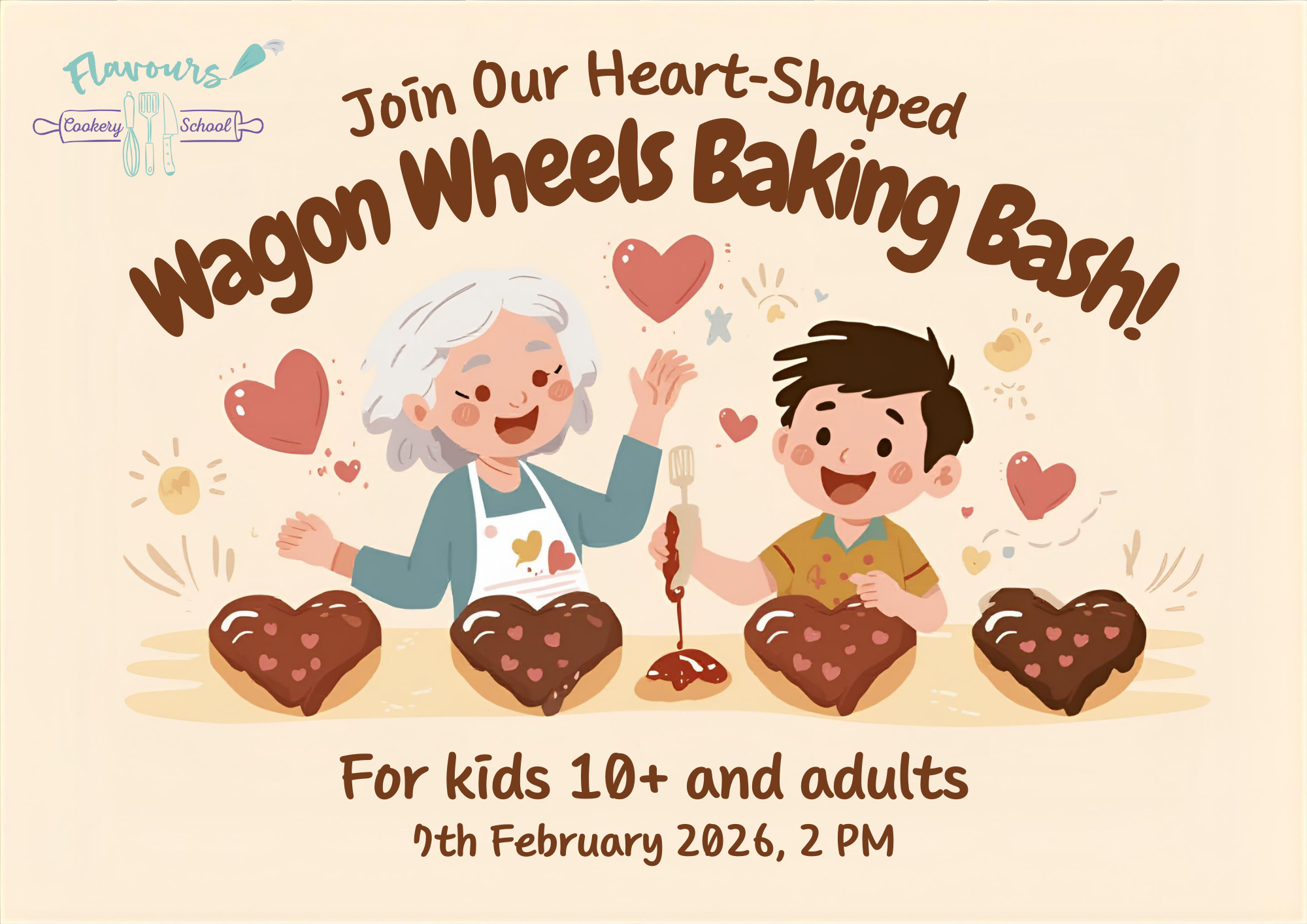 Join a delightful baking session designed for children aged 10 and above and adults. Learn how to make delicious heart-shaped chocolate-covered wagon wheels in a fun, hands-on environment. Perfect for families, friends, and anyone who loves baking and sweet treats.